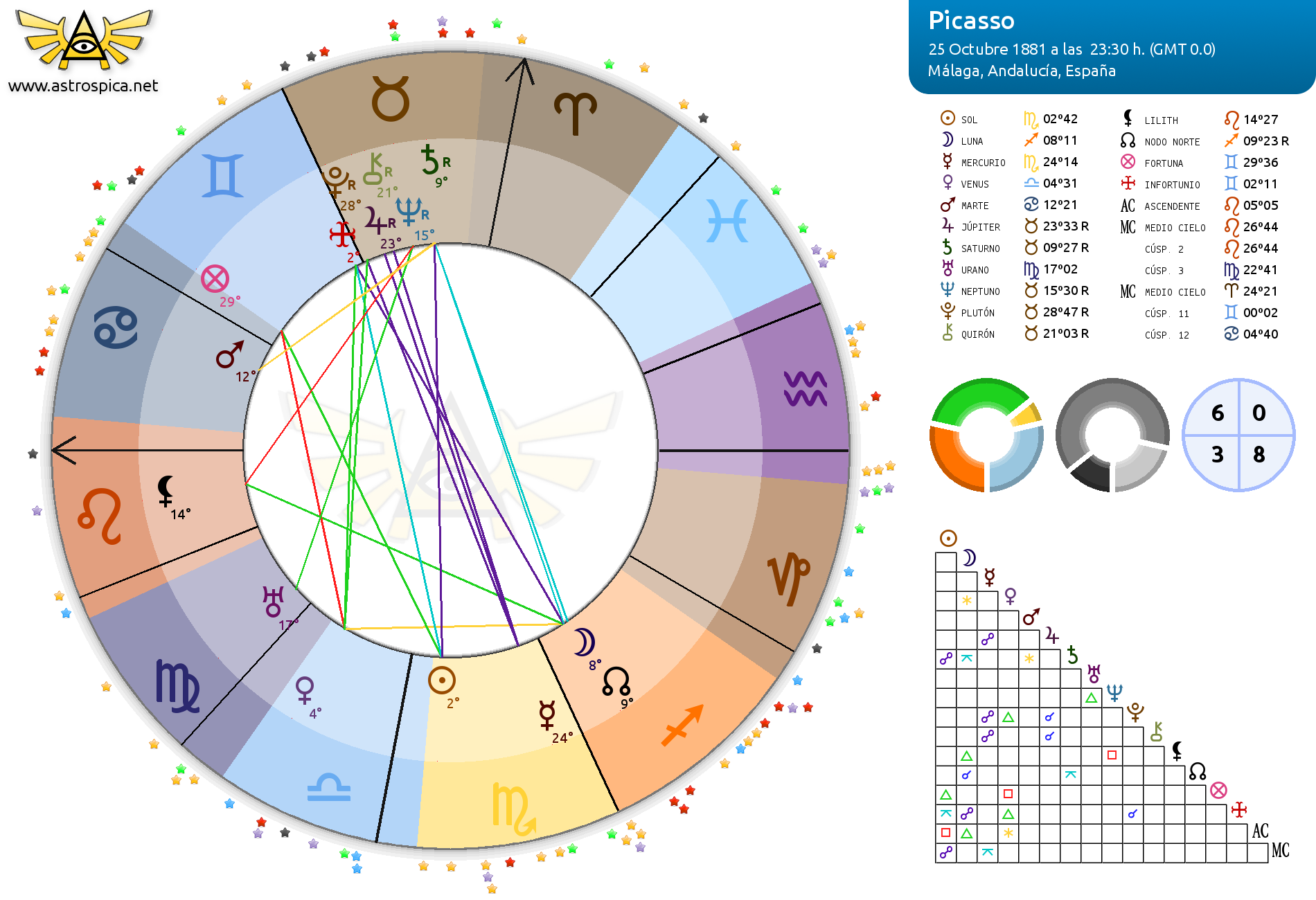Podemos observar además el imaginativamente enérgico Marte en Cáncer (regente de la cúspide de su casa 10, Aries), armónico mediante trígono con el sol en Escorpio y dispositor de éste, y mediante sextil con el stellium en la 10 en Tauro, pero inarmónico con el MC puro (Aries), Todo esto unido a Urano en Virgo, armónico para Picasso en cuanto a aspectos a Tauro y Escorpio (y receta final de su genio artístico), convierten esta carta natal en un gigantesco puzle cuyas piezas están desordenadas, mas no perdidas.