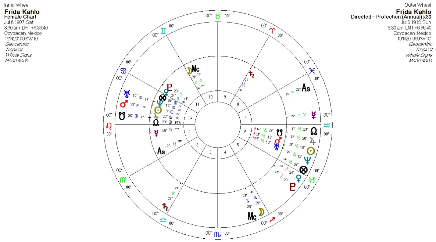 El método de profecciones (del Latín ‘pro facere’, literalmente ‘hacia adelante’ = ‘pro’ y ‘hacer’ = ‘facere’, que significa avanzar) se originó en la astrología helenística y fue popular en la Edad Media. Este método progresa todas partes de una carta natal a un ritmo de 30 grados (un signo) por año. Aquí ves la carta de Frida Kahlo progresada (por el método de profecciones) a su sexto cumpleaños y superpuesta en su carta natal.