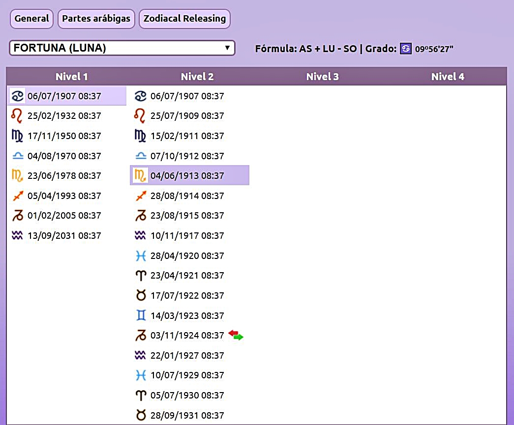 Ahora veamos su Zodiacal Releasing para el grave accidente de autobús el 17 de septiembre de 1925. De nuevo debemos considerar la liberación zodiacal desde la Parte de la Fortuna.