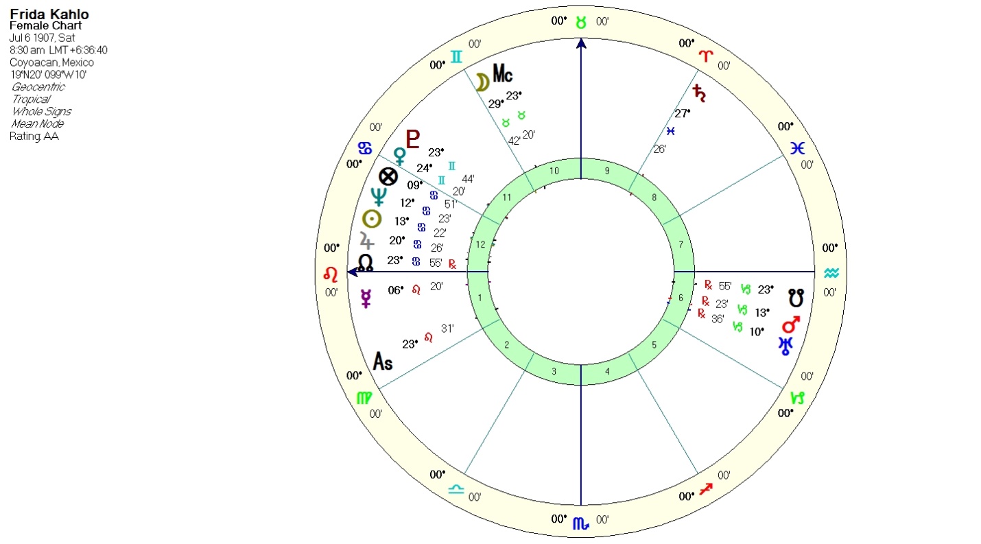 El ascendente de Frida se encuentra en Leo, gobernado por el Sol que reside en la desafortunada casa 12. El Sol está casi exactamente en oposición al Marte retrógrado, que se encuentra en la sexta casa de la enfermedad corporal. El aspecto más estrecho de su ascendente es un sextil de Plutón, un planeta cuya influencia marcó toda su vida. Su talento artístico se refleja en el sextil de Venus a su Ascendente, la conjunción de Neptuno con su Sol, y el hecho de que la Luna (exaltado in Tauro) en conjunción con su MC es su planeta más angular.