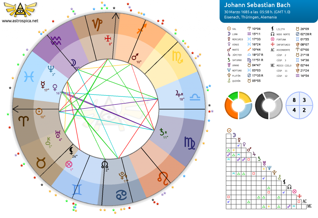 Es la frase más famosa del compositor barroco alemán Johann Sebastian Bach, para muchos, el mayor genio de la Historia de la Música y, para los astrólogos, poseedor de una de las cartas natales más intensas de todos los tiempos. Hoy, analizamos las partes más llamativas de su carta natal, centrándonos en el Stellium de 5 planetas en la casa 12 (3 de ellos en Piscis, su análogo signo), la casa de lo oculto, lo profundo, lo místico, lo divino.