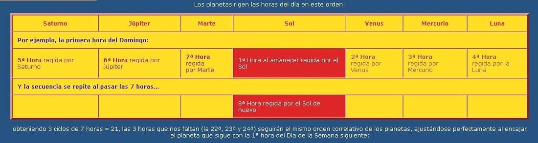 Así, la 1ª hora planetaria, al amanecer del Lunes, es regida por la Luna , la segunda por Saturno, la tercera por Júpiter etc. y así van rotando todos los planetas para cada Día de la Semana.