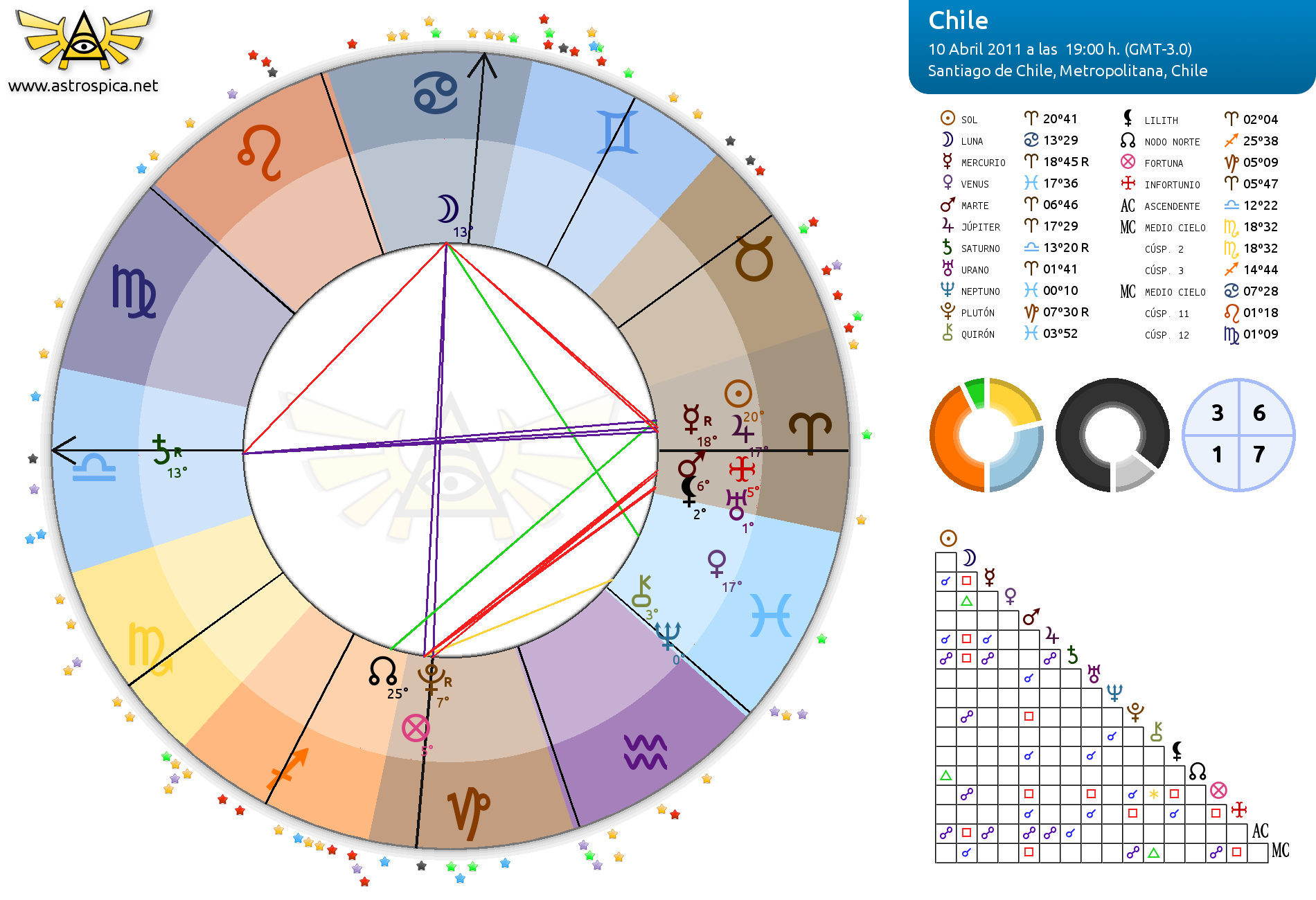 1. El 10 de abril de 2011, en Chile, se desencadenó una serie de manifestaciones, consideradas como una de las manifestaciones más importantes del siglo a favor de la democracia. Dichas manifestaciones proclamaron la lucha contra la privatización de las escuelas públicas. Si nos fijamos en la carta astral de ese mismo momento, podemos ver un Urano en Aries formando un stellium de 5 planetas junto al Sol, Mercurio, Marte y Júpiter: una inyección de rebeldía. La luna domiciliada, en cuadratura con este stellium, nos habla clarísimamente de una tensión entre esta necesidad de rebelarse y el confort que ha de suponer lo público, la juventud y la protección familiar de una patria.