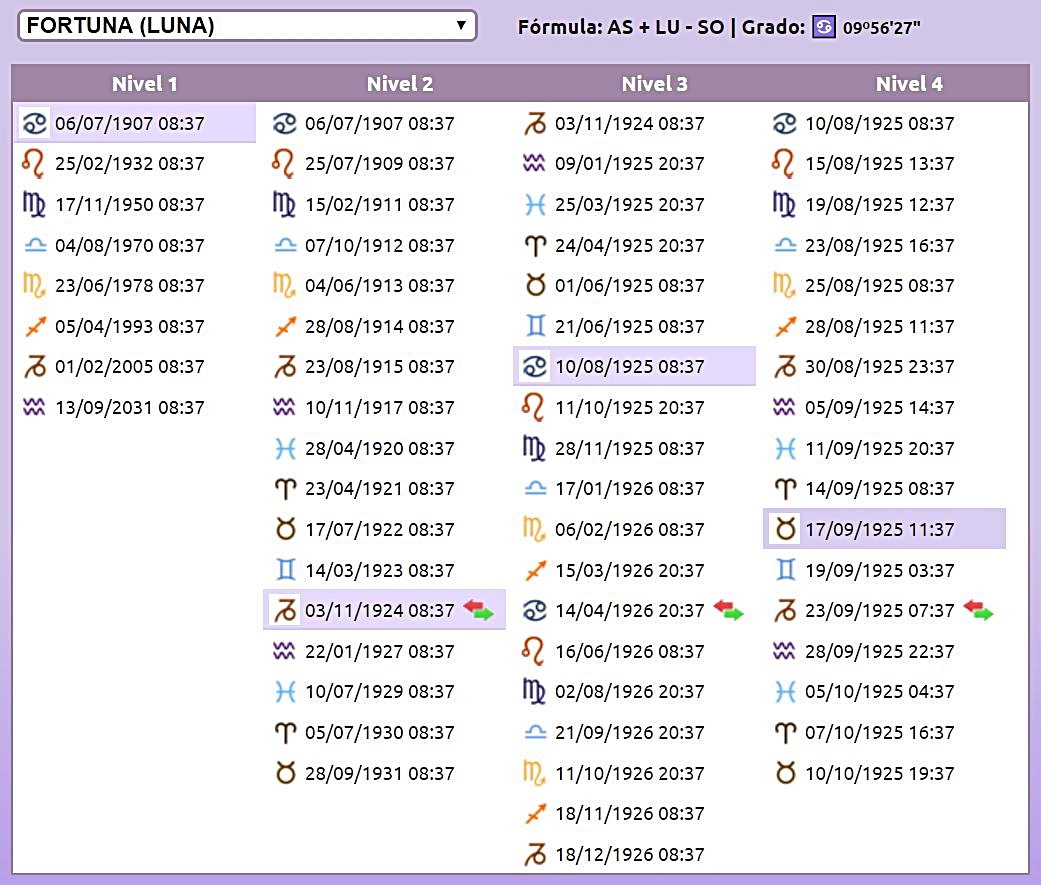 Ahora veamos su Zodiacal Releasing para el grave accidente de autobús el 17 de septiembre de 1925. De nuevo debemos considerar la liberación zodiacal desde la Parte de la Fortuna.