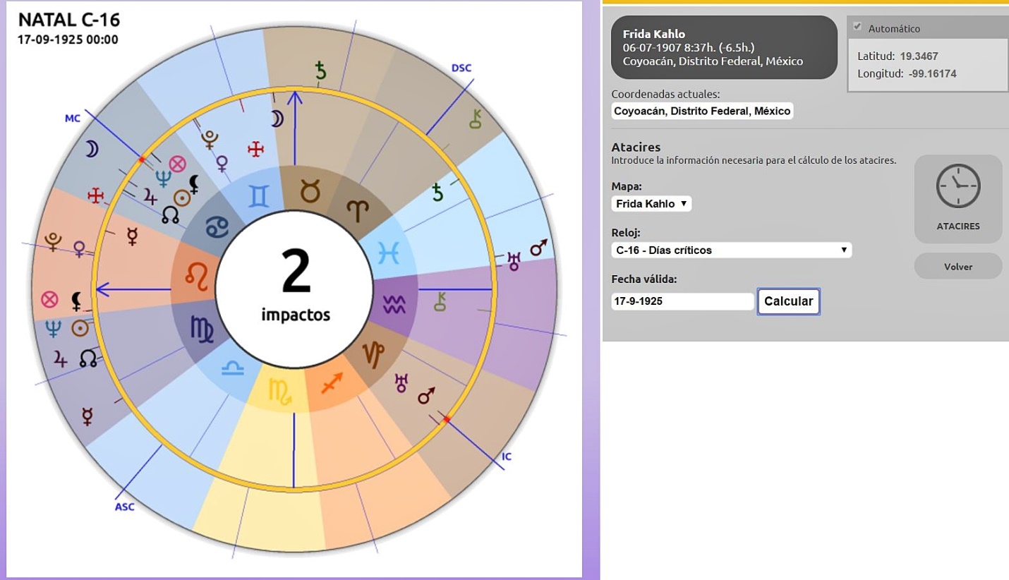 Finalmente, si consideramos los Atacires C-16 para los días críticos, vemos que el día de su grave accidente (17 de septiembre de 1925), el eje meridiano (MC/IC) activa la oposición natal del Sol / Neptuno en la casa 12 al Marte / Urano en la casa 6, que es es apto para el simbolismo de un accidente grave que tiene un efecto duradero en la salud.